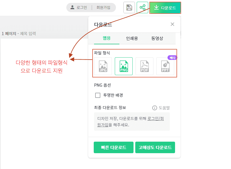 덤으로 저작권이 Free인 사진 라이브러리 제공, 예쁜 테마 색상들, Free 동영상들, 배경이미지, QR 코드와 바코드 생성, 예쁜 폰트들 및 아이콘들도 제공합니다. 드래드 앤 드롭(Drag and Drop)과 약간의 편집으로 나이쓰한 디자인 결과물을 만들 수 있습니다.