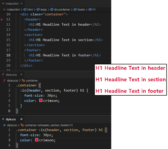 :is를 먼저 사용하지 않고 아래처럼 선택자의 하위 요소로 사용할 수도 있습니다.