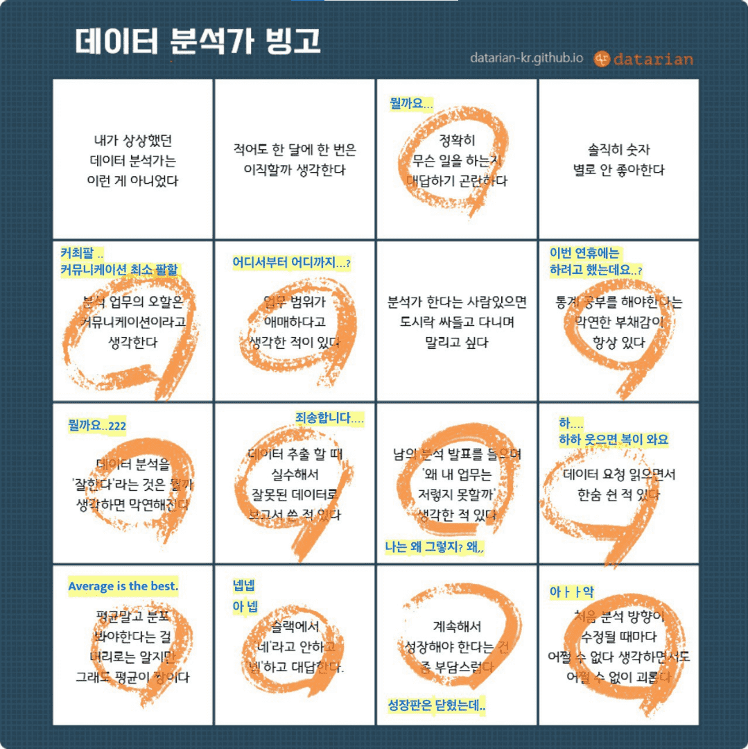 그 중에서도 아주 많이 심심했던 데이터리안의 두 멤버가 데이터 분석가 빙고를 만들었습니다.