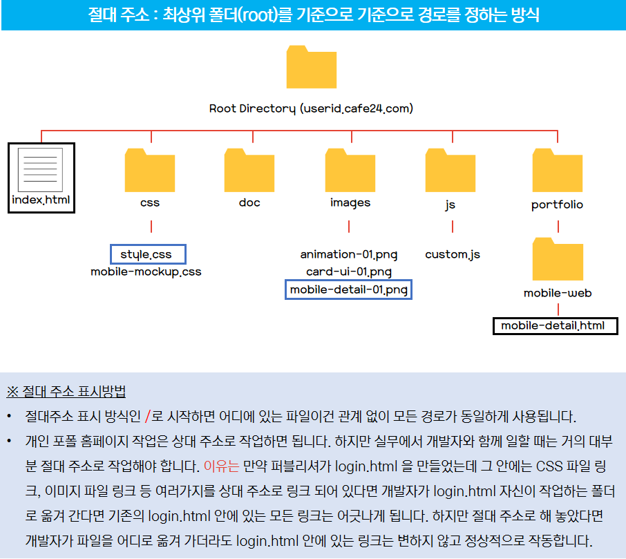 아래 나오는 간단한 폴더 구조와 파일을 실제로 탐색기 또는 텍스트 에디터에서 예시처럼 만들어 보시고 상대 주소로 링크하고 절대 주소로 링크하는 연습을 해보셔야 합니다. 그래야 실전 개인 포트폴리오 홈페이지 제작에서 혼선 없이 작업할 수 있습니다.