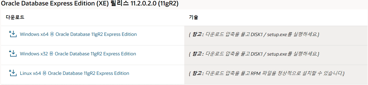 https://www.oracle.com/kr/database/technologies/xe-prior-releases.html