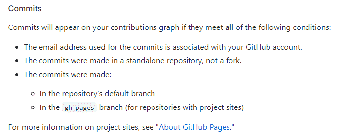 - https://docs.github.com/en/github/setting-up-and-managing-your-github-profile/managing-contribution-graphs-on-your-profile/why-are-my-contributions-not-showing-up-on-my-profile