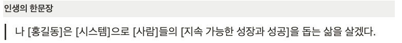 만약 인생 한문장을 만드는 것이 막막하다면 다음 포맷을 활용하시는 것을 권합니다.