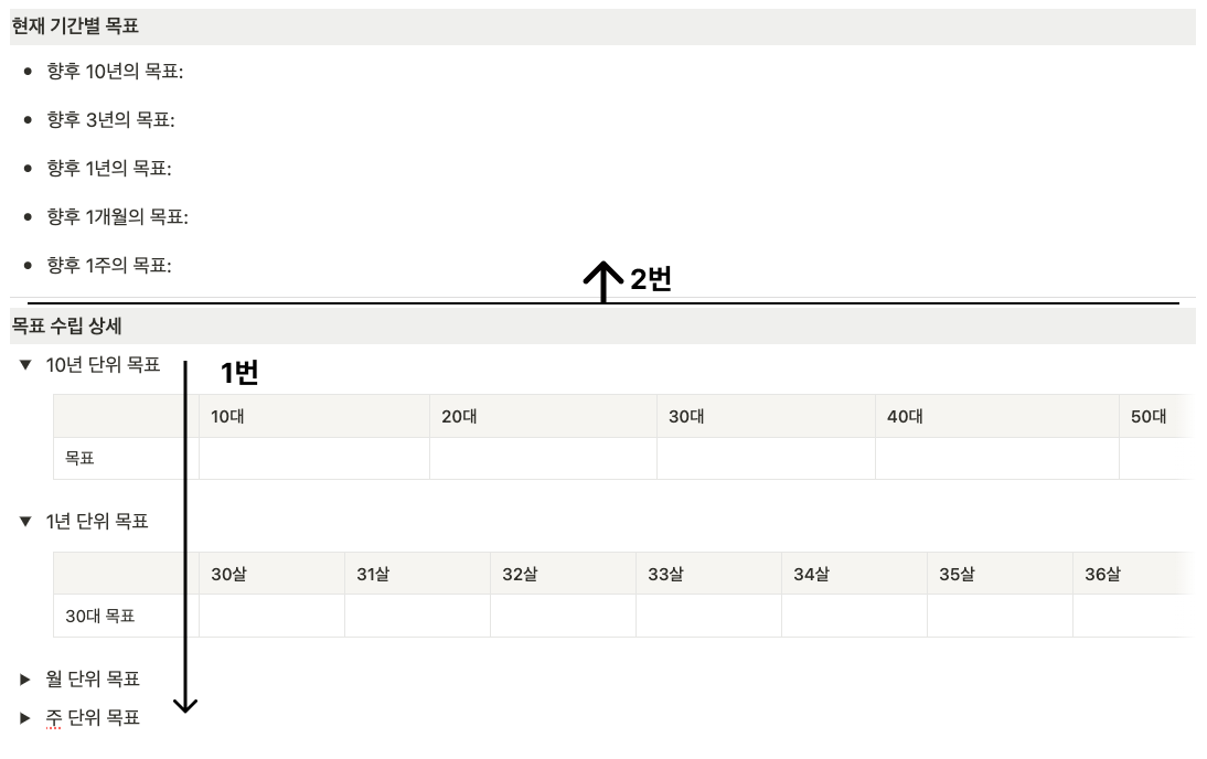 3. 10년 > 1년 > 1개월 > 1주 단위의 목표를 세분화 하여 기록합니다.