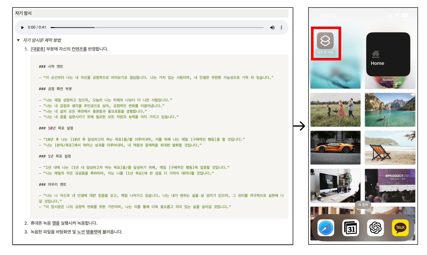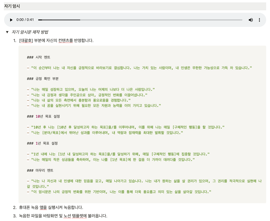 : 매일 들을 수 있도록 나의 목표와 긍정의 확언들을 담아 자기 암시문을 녹음 파일을 만듭니다.