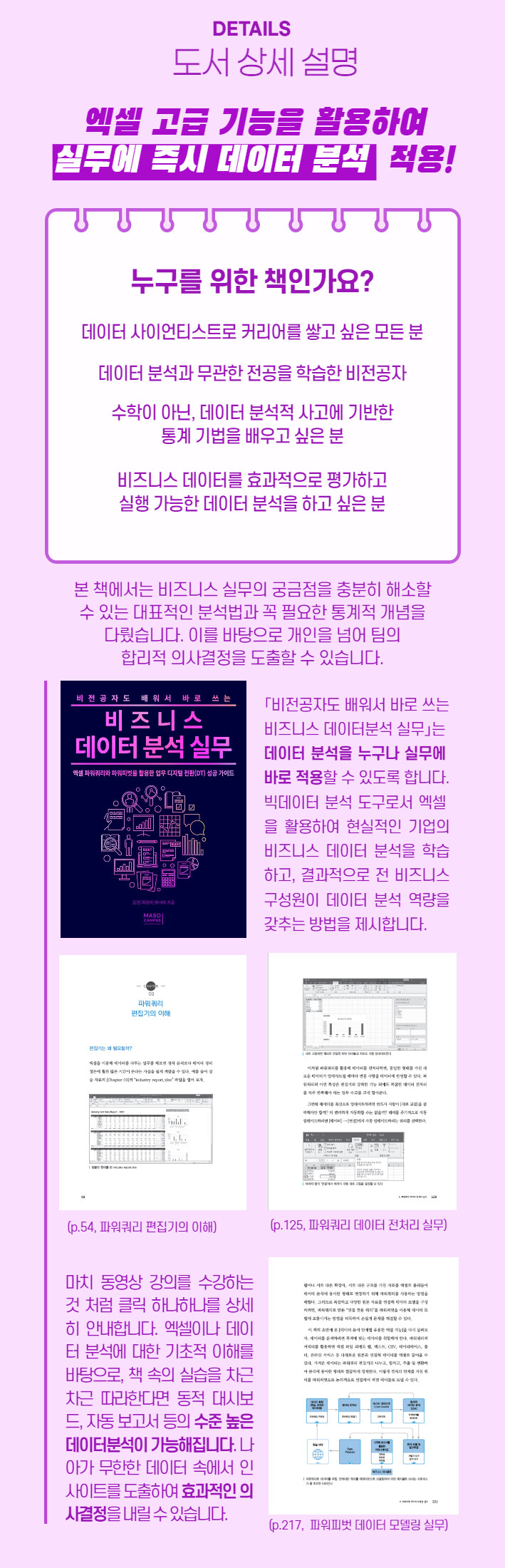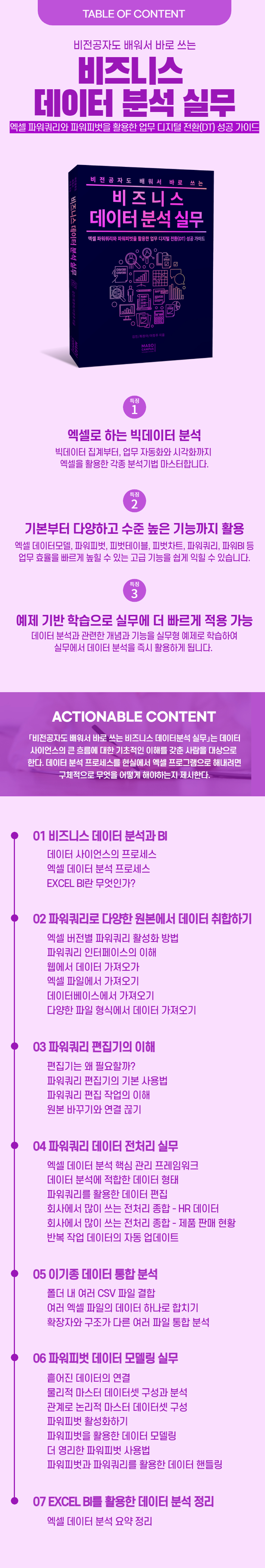 엑셀에는 업무 활용도는 높지만 생소해서 평소 활용이 어려운 고급 기능들이 있습니다. 「비전공자도 배워서 바로 쓰는 비즈니스 데이터 분석 실무」는 이러한 고급 기능들을 쉽게 익히게 돕는 도서입니다. 빅데이터 집계부터 업무 자동화까지, 엑셀로 가능한 각종 분석 기법을 단기간에 마스터하고 현업 실무에 즉시 적용하도록 보조합니다.