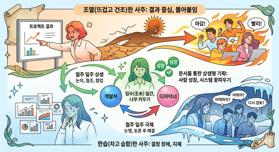 내 사주가 너무 '조열(뜨겁고 건조)'하면 결과만 몰아붙이게 되고, 너무 '한습(차고 습함)'하면 결정 장애가 올 수 있죠.