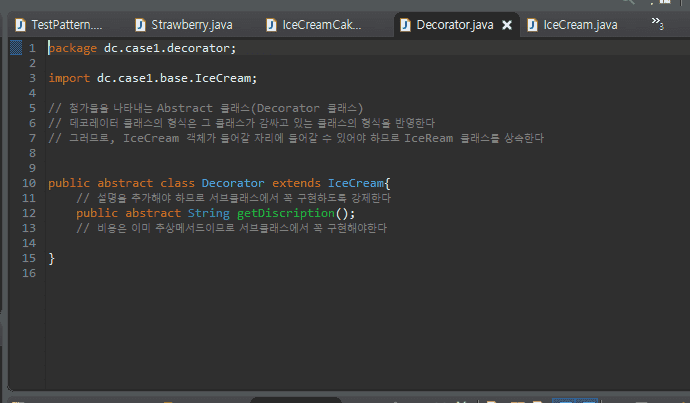 작성하신 코드를 보니 Decorator 클래스 역시 추상클래스로 정의되어 있기 때문입니다.