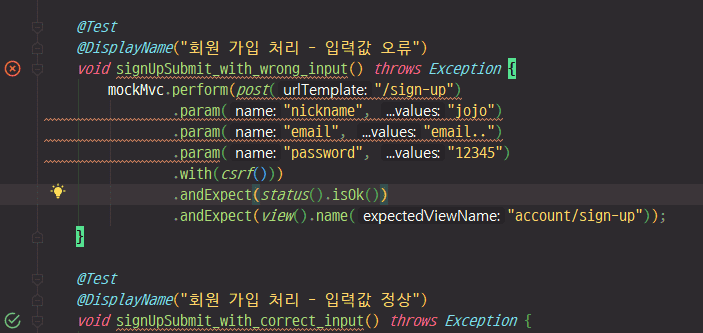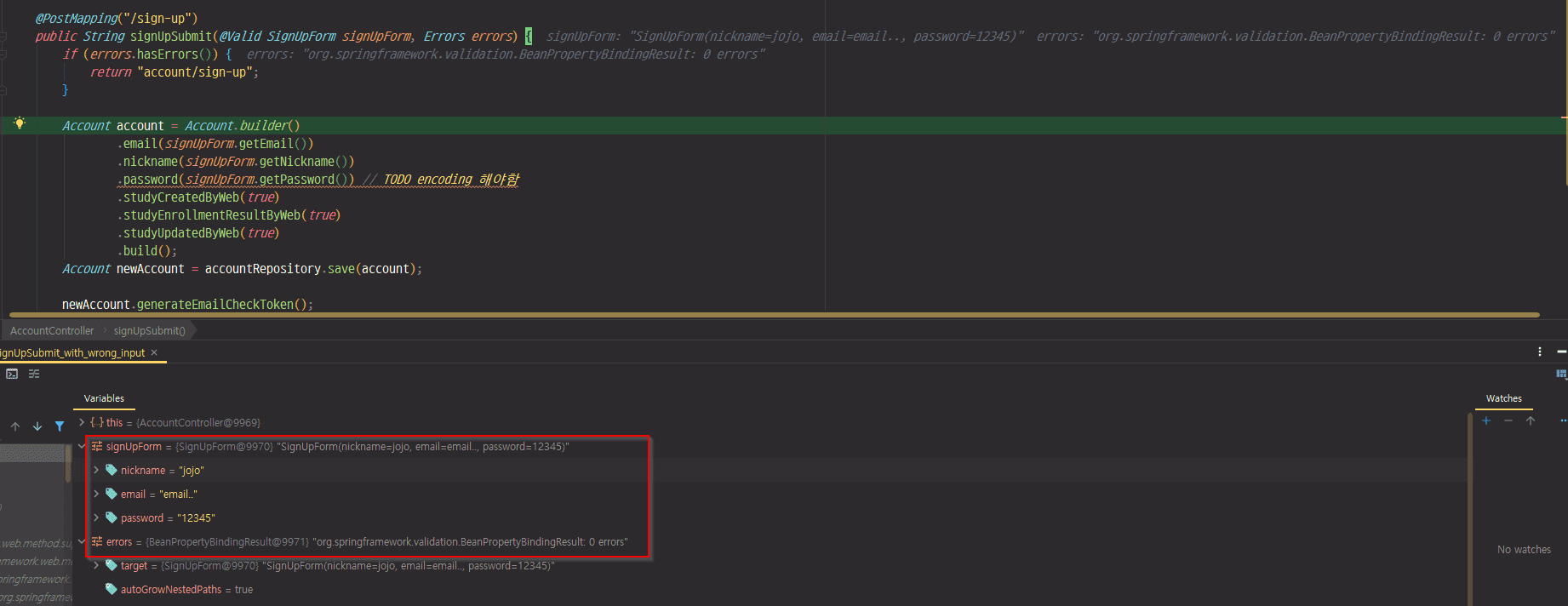 기대값은 200 ok 인데 자꾸 redirect 302가 떨어져서 디버그 돌려봤는데 아래와 같이 오류 입력값임에도 불구하고 에러를 못잡더라구요..