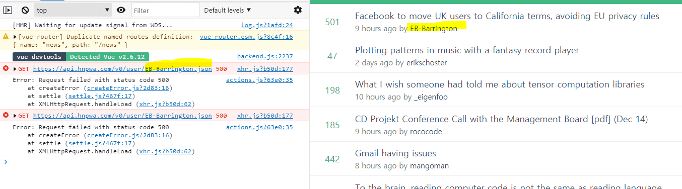 route를 통해서 작성자의 id를 받고, 이를 api를 통해 json으로 받는 과정에서 오류가 났습니다. 다른 닉네임은 전부 정상적으로 데이터를 받는데 EB-Barrington이라는 아이디는 불가능합니다.