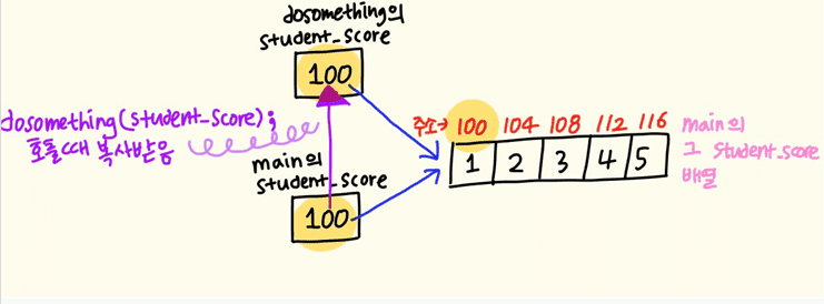 - student_score = student_score 이렇게 넘긴 파라미터가 doSomething의 매개변수인 포인터에 복사되는 과정이 일어납니다. 전자는 doSomething의 매개변수 포인터고, 후자는 main 함수 안에있는 그 배열입니다.