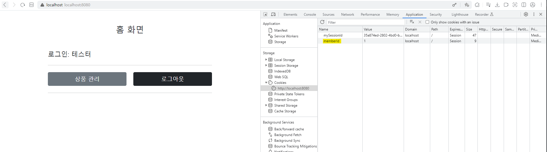 주어진 코드를 확인해보니, memberId 값이 세션 저장소에 저장되어 있지 않고, 쿠키로 전달되는 것을 확인할 수 있습니다. 현재 코드에서 memberId 쿠키를 생성하고 응답에 추가하여 클라이언트로 전송하고 있습니다.