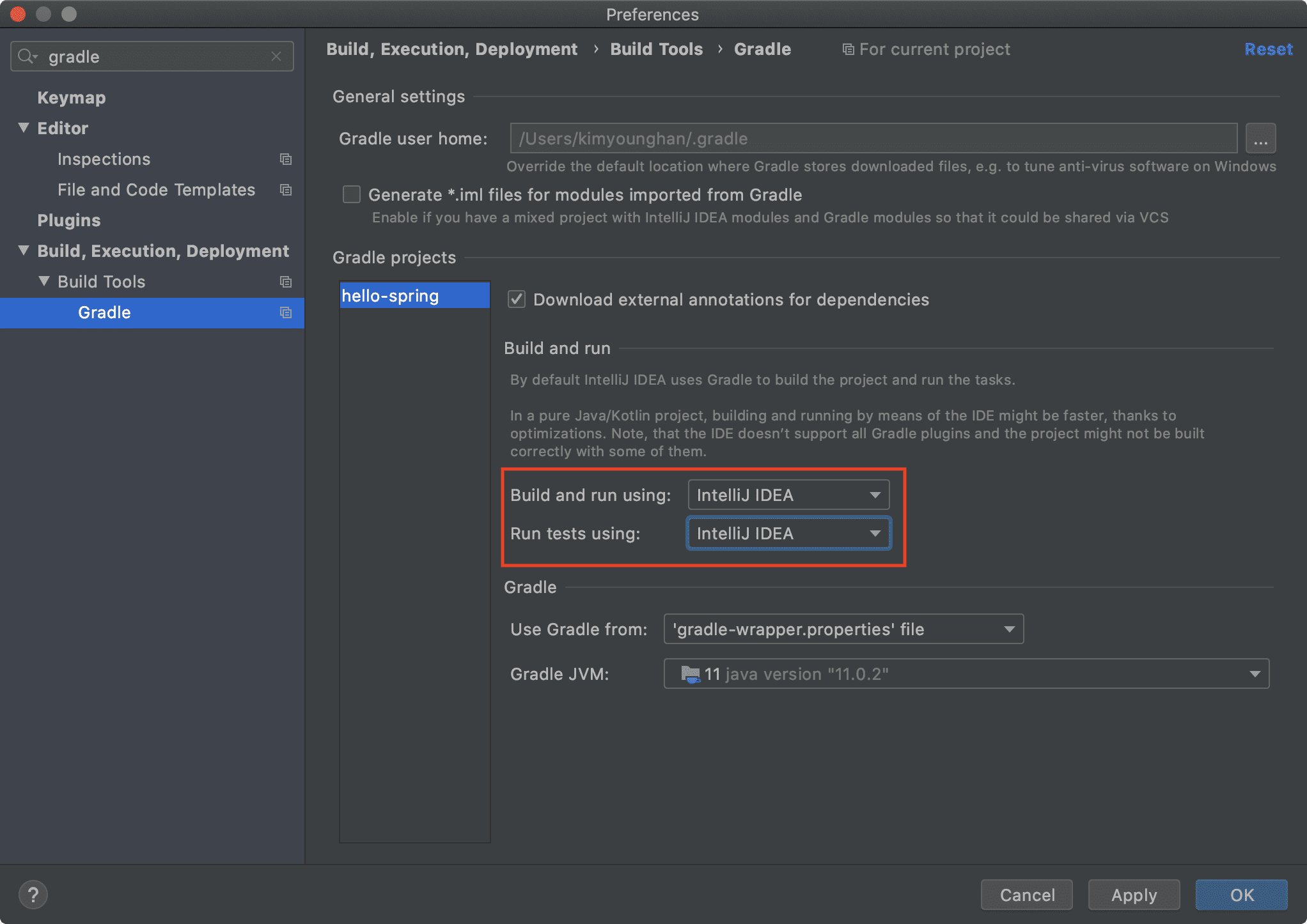 최근 IntelliJ 버전은 Gradle을 통해서 실행 하는 것이 기본 설정이다. 이렇게 하면 실행속도가 느리다. 다음과 같이 변경하면 자바로 바로 실행해서 실행속도가 더 빠르다.