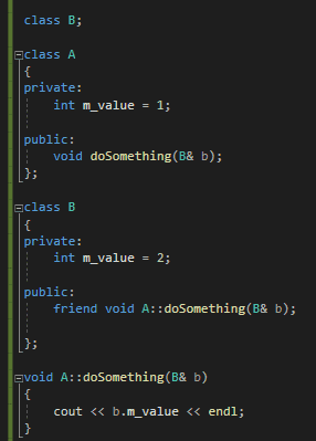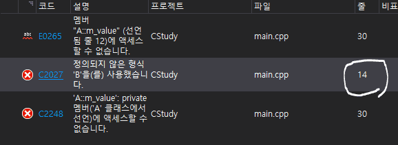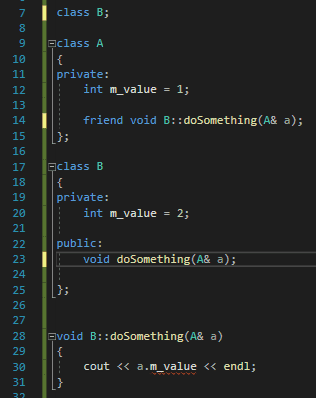 오류 메세지를 확인해보면 클래스 A 의 친구 선언인 friend void B::doSomething(A & a); 가 있는 줄인 14번째 줄에서 정의 되지 않은 형식 B 를 사용했다고 알려주고 있습니다. 이 오류가 난 이유는, A가 B의 doSomething 멤버 함수를 친구로서 선언하겠다고 시점에서의 B 클래스의 모습은 class B; 👈 이게 다였기 때문입니다.즉, A가 B의 doSomething 멤버 함수를 친구로서 선언하겠다고 시점에는 전방 선언을 통해 B라는 클래스가 있다는 것을 알고 있기는 하지만 B 클래스에 doSomething 멤버 함수가 있는지는 모르기 때문입니다. 저 시점에서 A가 알고 있는 B의 모습은 class B; 이게 다이기 때문이죠. 당시 A의 입장에선, B에겐 아직 아무런 멤버 함수도 없는걸로 알고 있는데 B의 멤버 함수를 친구로 선언했다고 알려줬으니 B의 doSomething 함수가 제대로 친구로 등록되지 못했기 때문에 B의 doSomething 에서 A의 private 멤버인 m_value에 접근할 수가 없었던 것입니다.
