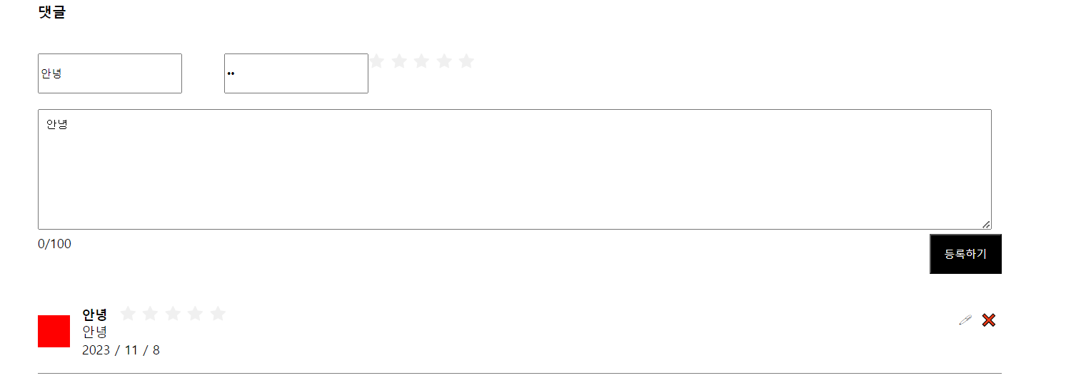 댓글 기능 창에서 input에 작성자 비밀번호 내용을 입력하고 등록하기 버튼을 클릭하면 댓글이 잘 생성이 되지만 input창이 비어지지 않습니다.