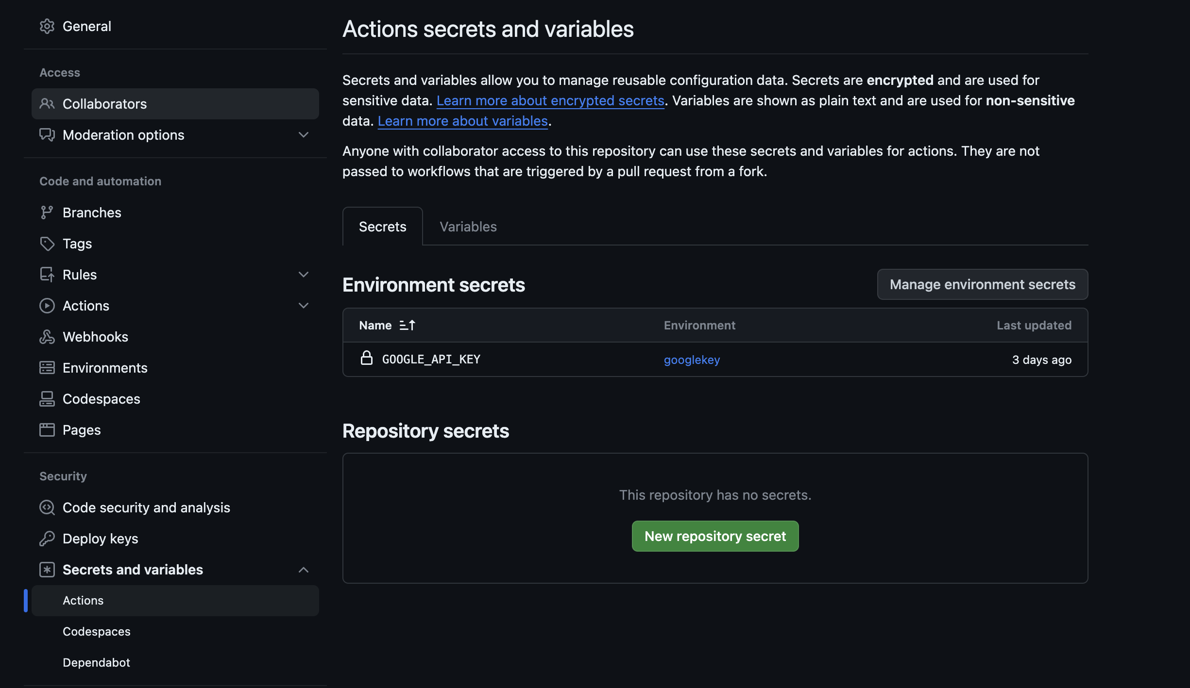 현재는 세팅 -> 시크릿 -> 액션에 구글 apikey를 저장해서
