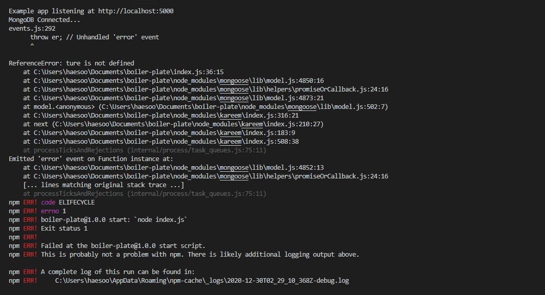 해결했습니다. true가 정의되지 않았다길래 다시 살펴보니 true에 오타가 있었습니다. ㅠㅠ