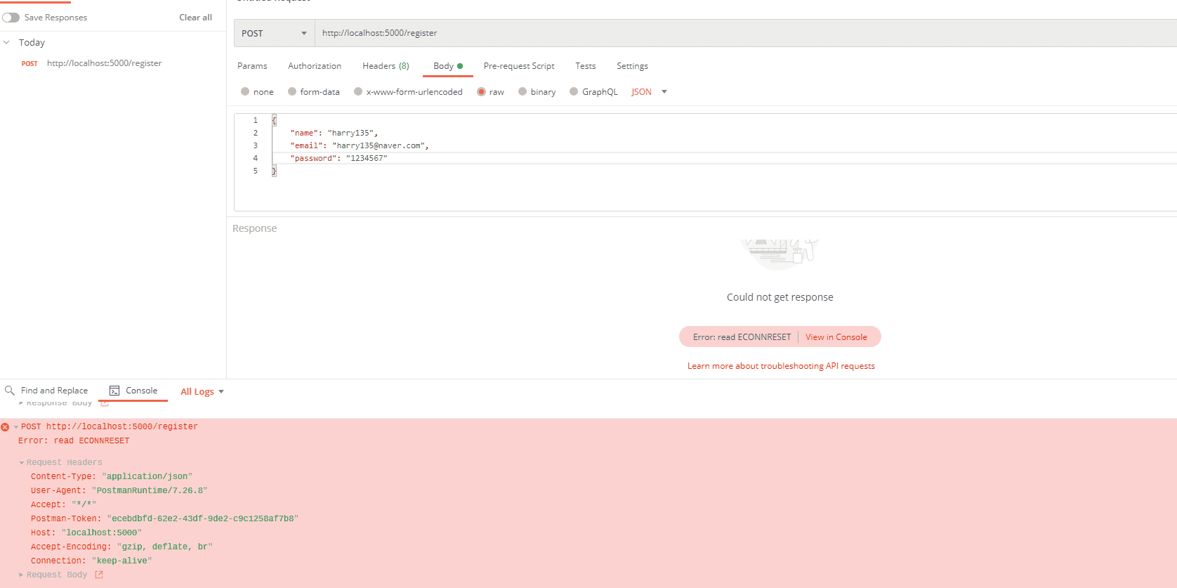 회원가입시 포스트맨에서 계속 오류가 납니다.