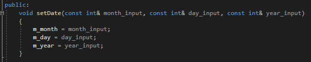 setDate 는 Date 의 public 한 멤버 함수이기 때문에 이렇게 main 함수에서 직접 호출이 가능합니다. 외부에선 m_month 에 접근할 수가 없어 직접 today.m_moth = 8; 을 해주는게 불가능 했지만 setDate 멤버함수는 public 이라 호출이 가능하기 때문에 setDate(8, 4, 2025) 를 호출만 해주면 얘가 직접 함수 내부에서 today.m_month = 8; 을 해주는 셈입니다. setDate 는 같은 Date 클래스 멤버 함수라 private 한 멤버 변수들에 접근할 수 있는 자격을 가지고 있으니까요! 접근 함수는 이렇게 private 한 멤버들을 외부에서 간접적으로 접근하기 위해 만듭니다.