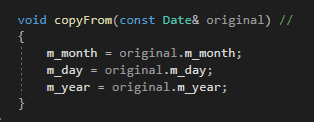 copyFrom 의 매개 변수인 const Date & original 은 Date 타입의 '객체'를 파라미터로 받는다는 것을 의미합니다. 같은 Date 타입의 다른 객체의 멤버 변수 값들로부터 내 멤버 변수 값들을 초기화 시킬 것이니, 그 같은 Date 타입의 다른 객체를 파라미터로 받아 와야겠죠!