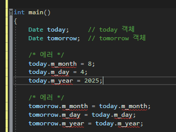 private 멤버는 클래스 외부에선 접근이 불가능합니다. Date 클래스의 멤버 변수들인 m_month, m_day, m_year 은 private 하기 때문에 같은 클래스인 Date 의 멤버 함수들에서만 접근이 가능합니다. 따라서 main 함수는 Date 클래스에 속해있는 함수가 아닌 Date 클래스와 상관없는 외부 함수이므로 main 함수 내에서는 Date 클래스로부터 만든 today, tommorow 객체의 멤버들을 직접 호출할 수가 없습니다. 그래서 위와 같이 main 함수내에서 Date 타입의 두 객체의 private 멤버 변수들을 저렇게 직접 쓰기만 해도 바로 빨간 줄이 그어지는 것을 확인할 수 있죠.