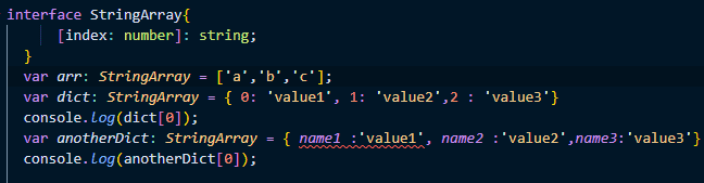 var anotherDict: StringArray = { name1: 'value', name2: 'value2', .....};