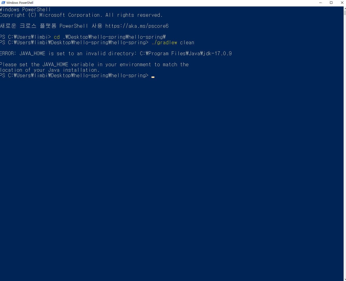 powershell에서 확인한 내 자바 버전이 17.0.9인 것을 확인 후 내 컴퓨터 환경 변수에 들어가서 C:\Program Files\Java\jdk-17.0.9 변경해봄
