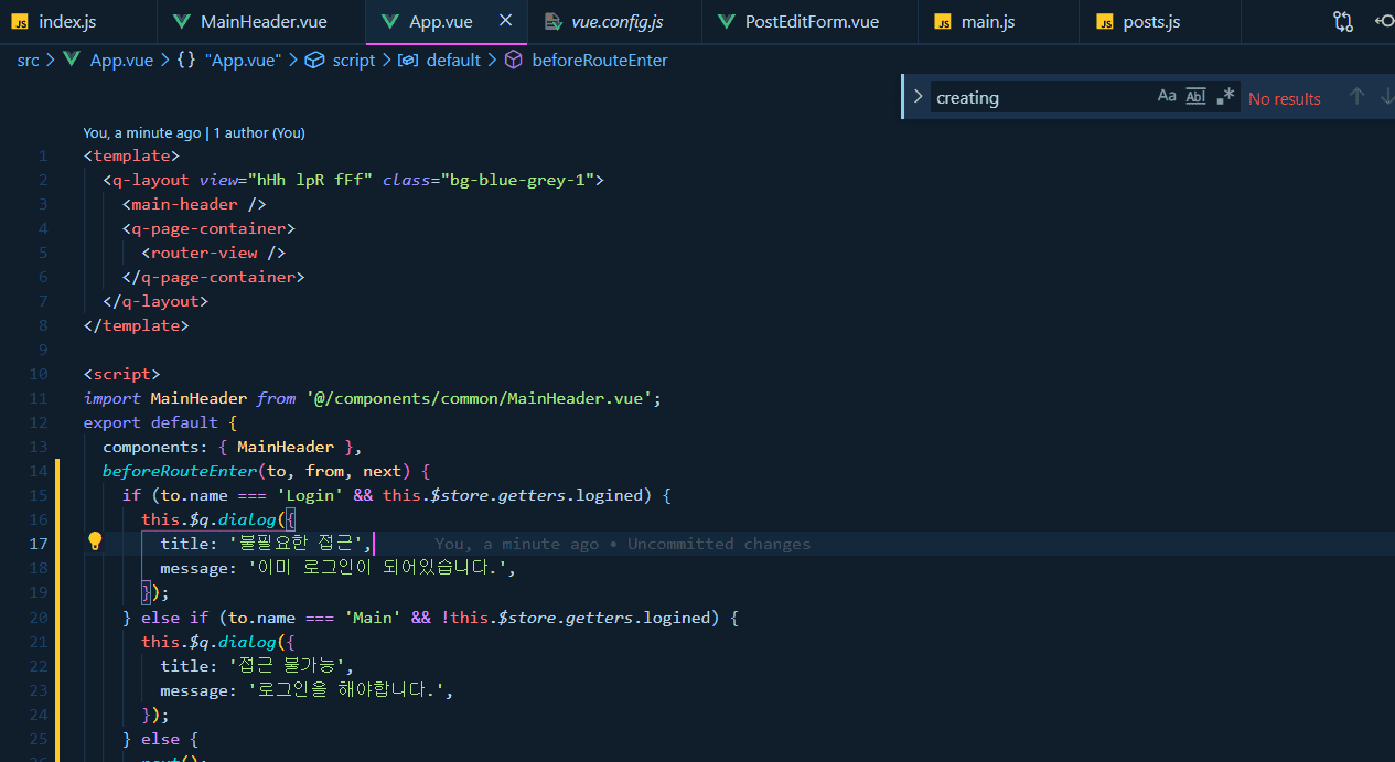 안녕하세요 대현님, 로그인 여부로 권한 제어 하시려는 페이지에 beforeRouteEnter를 넣어주시면 됩니다. 제가 프로젝트 구조를 알 수가 없어서 더 이상 팔로업은 힘들 것 같고 로직이 잘 분기가 되는지 먼저 콘솔이나 디버거를 활용해보시는게 좋을 것 같아요. 위 코드 기준으로는 dialog가 동작하더라도 UI 상으로 나타날 수 없는 구조라면 코드가 동작하지 않는 것처럼 보일 것 같습니다 :)