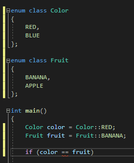클래스로 영역을 제한함으로써 이제 color 와 fruit 는 클래스가 달라 비교가 불가능해졌기 때문에 이렇게 에러가 뜨는 것이 정상입니다.