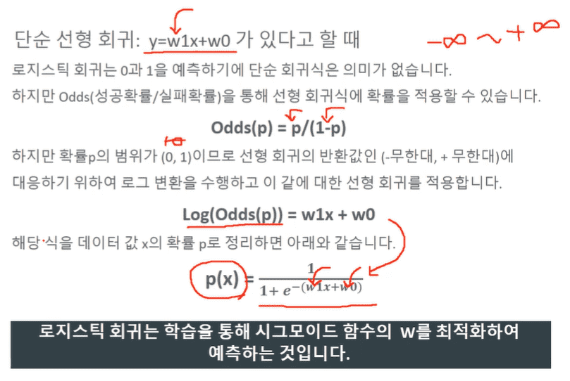 Odds(p)가 뭐길래 선형 회귀식에 확률을 적용할 수 있는지, 왜 Log(Odds(p))가 w1x + w0인지 모르겠습니다.