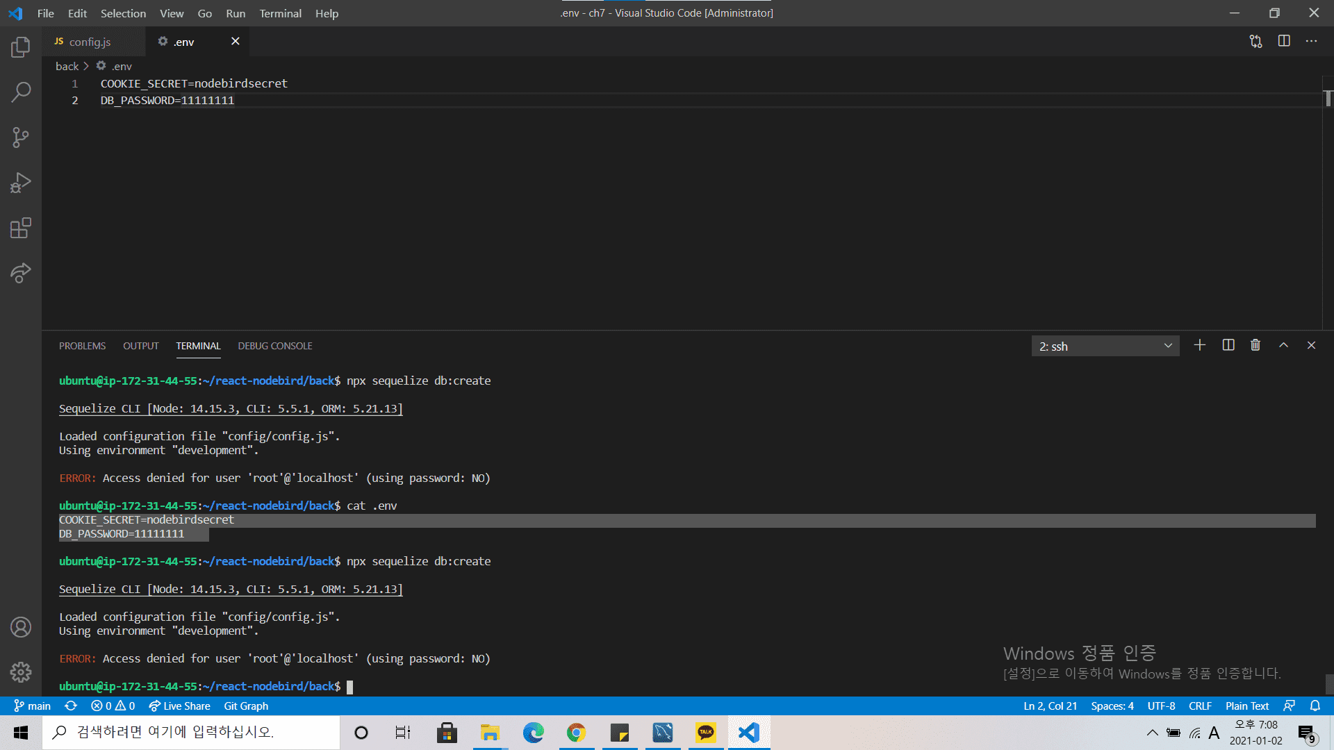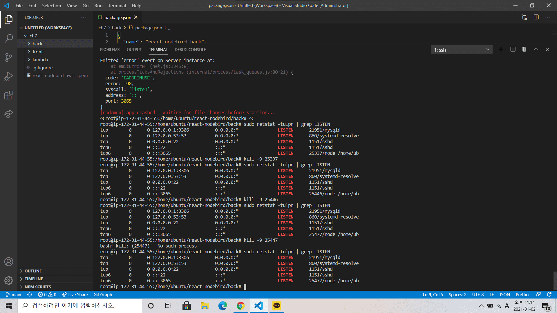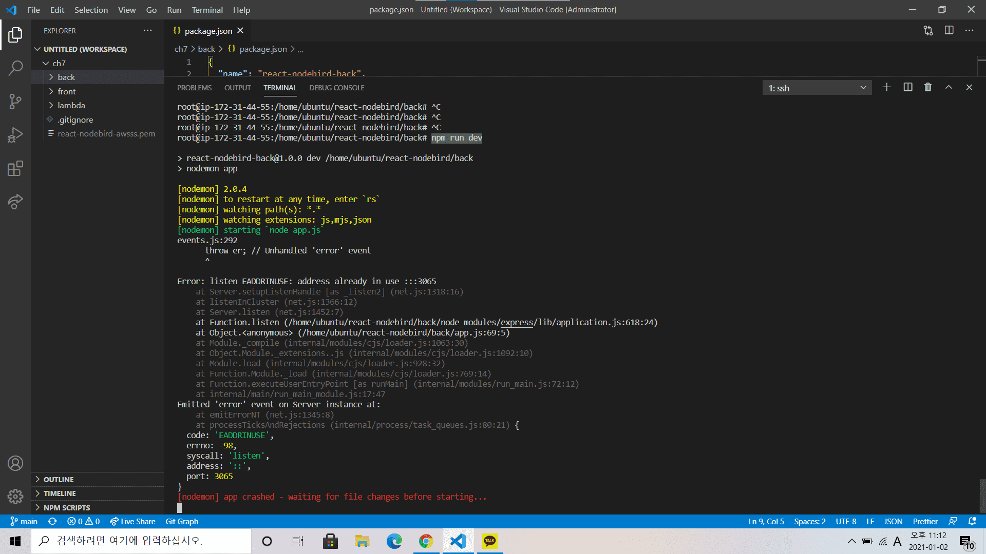 제로초님 방금것은 해결했는데 9:25초에서 명령어를 실행하면 server오류가 뜨는게 해결법을 못찾겠어서 질문드립니다 ㅜㅜ