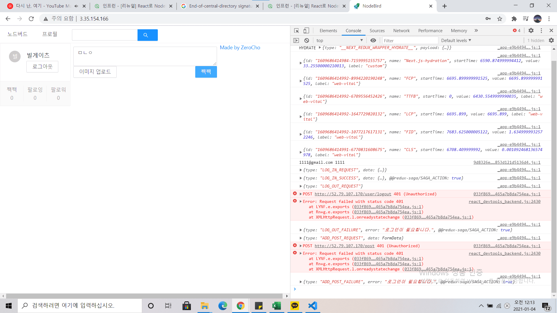그런데 로그아웃을 하거나 게시글을 작성하거나 다른시도를 할때는 오류가 뜹니다.