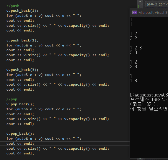 예상대로 push를 할 때는 size와 capacity가 함께 커졌고, pop을 할 때는 size는 작아졌으나 capacity는 그대로였습니다.