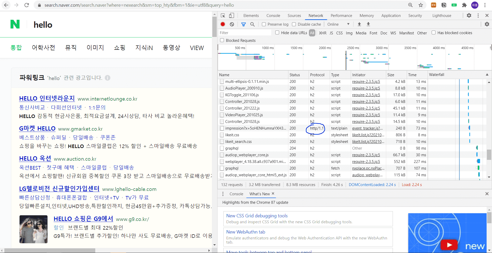 예를 들어, 네이버에 hello를 검색해보면 개발자 도구를 켰을 때, 다음과 같이 나옵니다.