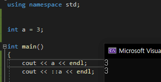 사실 namespace 없이 선언되는 전역변수도 사실은 이름없는 namespace 에 속해 있는 것이나 마찬가지입니다. 이름 없이 ::a 을 호출해도 정상적으로 3이 출력되는 것을 확인할 수 있습니다.