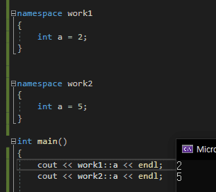 work1의 a나 work2의 a 나 둘 다 전역 변수입니다. 네임스페이스로 두 전역변수를 work1::a 과 work2::a 로 구분지을 수 있게 되었다는 정도로 생각해주시면 될 것 같습니다.