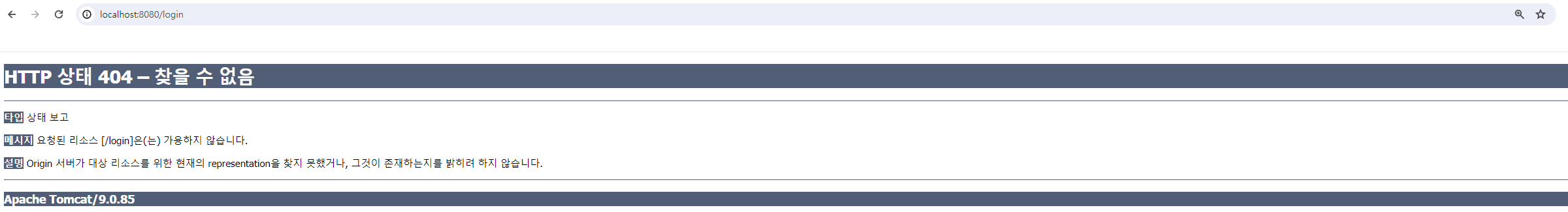 localhost:8080/login으로 접근 시 404 에러가 발생한다면, 애플리케이션을 실행하는 어플리케이션 서버(Tomcat 등)의 로그를 확인해 보세요. 로그에는 부트스트랩 과정이나 요청 처리에서의 오류 상세 정보가 포함될 수 있습니다.