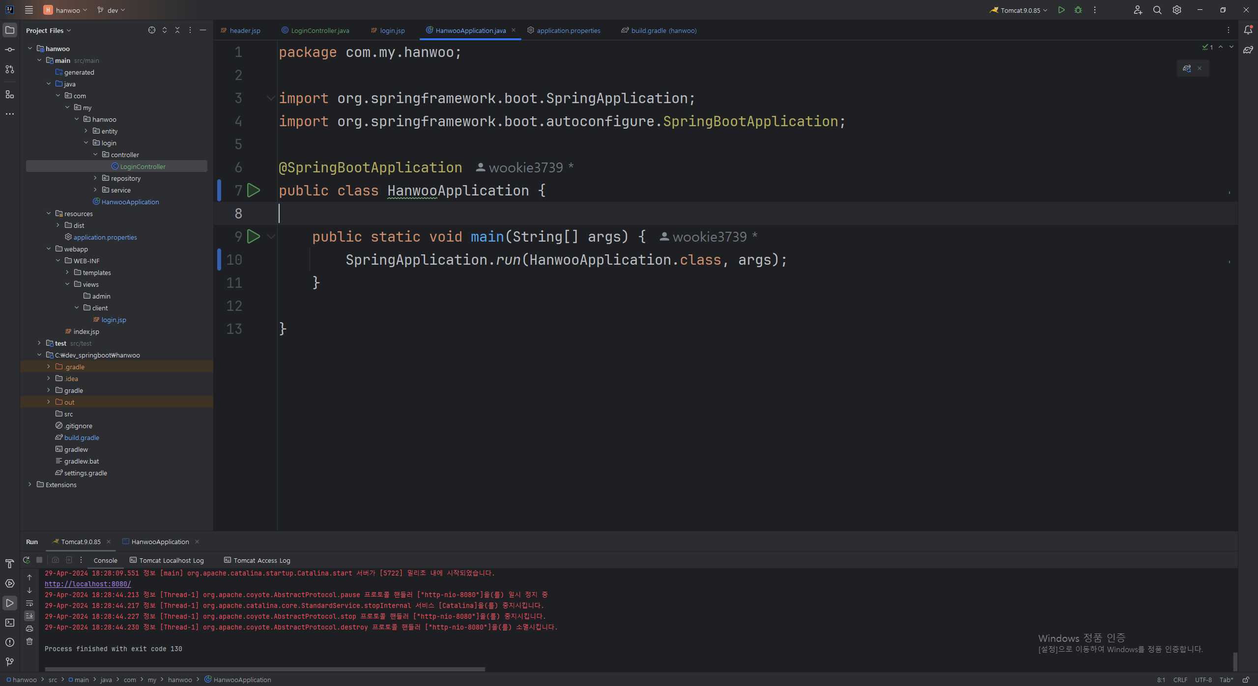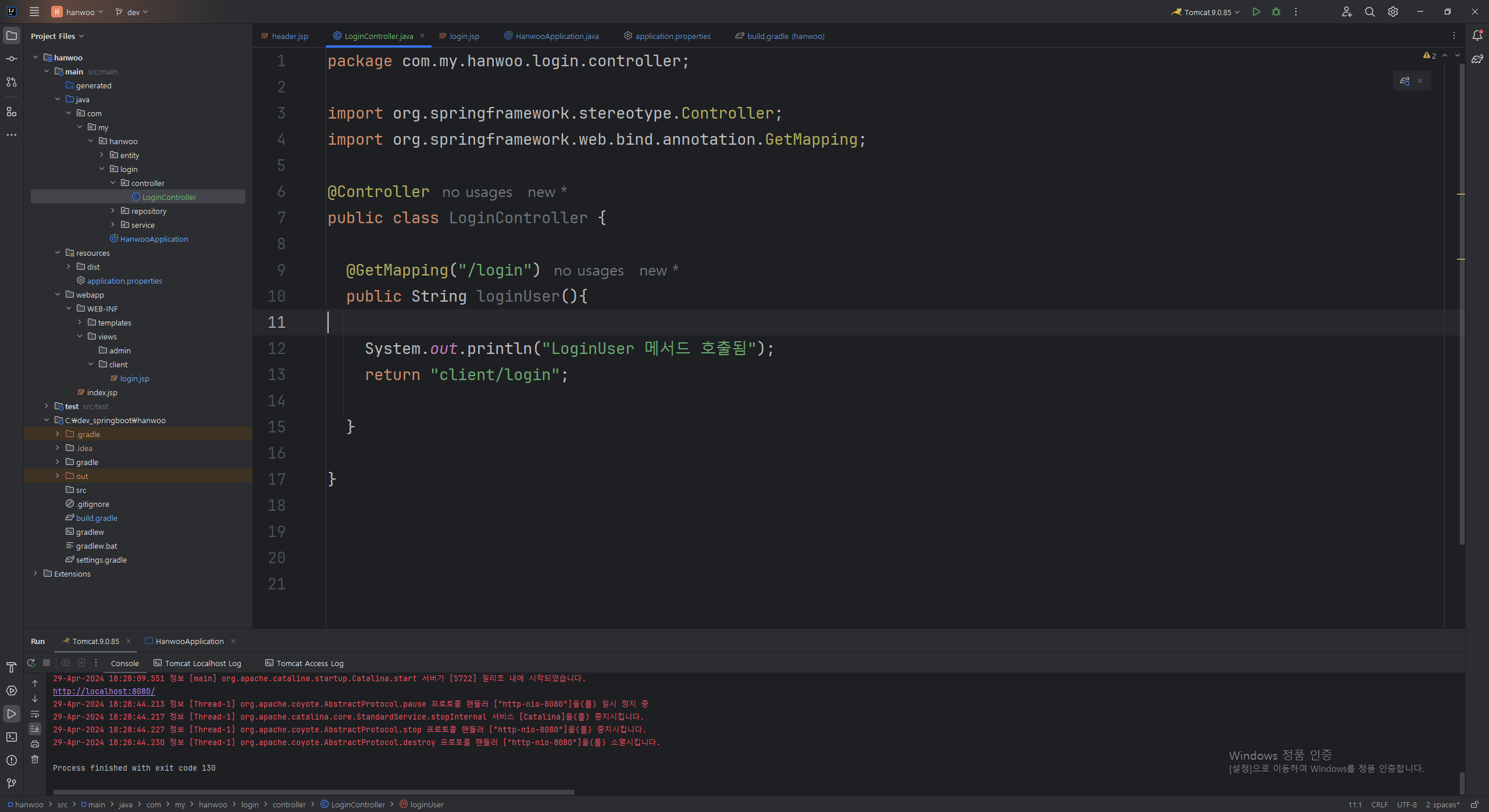 application.properties에서 설정한spring.mvc.view.prefix와spring.mvc.view.suffix설정이 적절한지 확인해보세요. 이 설정은 Controller에서 반환하는 뷰 이름을 실제 JSP 파일 경로로 매핑하는데 사용됩니다. 예를 들어,LoginController에서"client/login"을 반환했다면, 실제 뷰 경로는/WEB-INF/views/client/login.jsp가 됩니다. 해당 경로에 JSP 파일이 올바르게 위치해 있는지 확인해주세요.서버 설정 및 JSP 지원: 스프링 부트는 내장된 톰캣 서버를 사용하여 애플리케이션을 실행합니다. JSP를 사용하기 위해서는 추가적인 설정이 필요한데요,