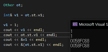 int &v1=ot.st.v1;에서 왼쪽 v1 과 오른쪽 v1 은 같은건가요 아니면 왼쪽 v1은 그냥 별명으로 둔건가요?