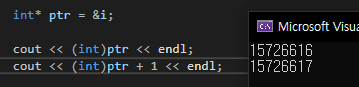이렇게 포인터로서의 상태에서 1 더하면 int 크기인 4만큼 더해진 것을 확인할 수 있습니다. (하나의 주소 공간의 크기가 1byte이므로 int 는 4 칸을 차지하니까 이렇게 int 데이터끼리는 주소가 4씩 차이가 나는거에요!)