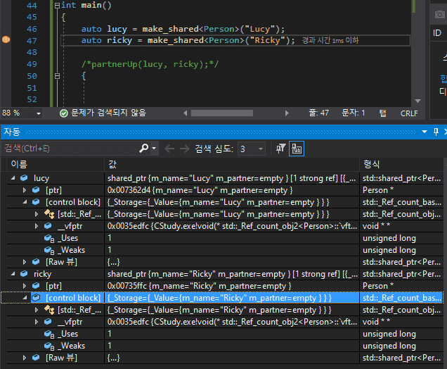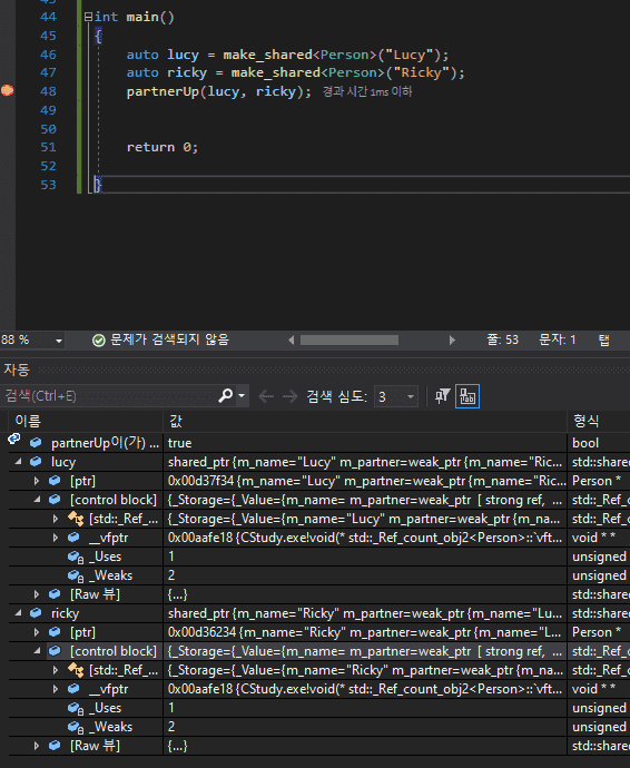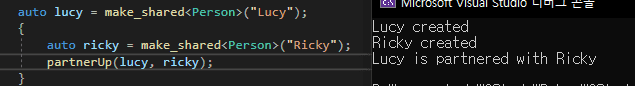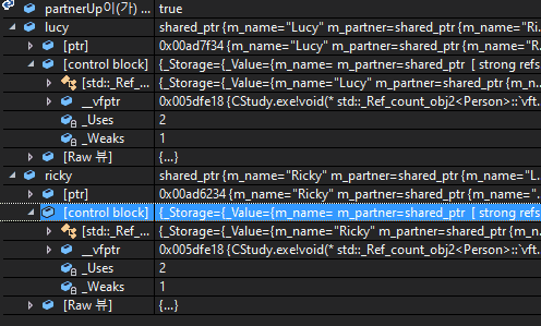 partnerUp 함수 호출을 통해서 Person("Lucy") 객체의 weak_ptr 멤버인 m_partner은 'ricky' shared_ptr을 대입 받아 Person("Ricky")객체를 참조하게 되고, Person("Ricky") 객체의 weak_ptr 멤버인 m_partner은 'lucy' shared_ptr을 대입 받아 Person("Lucy") 객체를 참조하게 됩니다. 즉 순환참조를 하게 되었습니다. 카운팅 값인_Uses를 보면 1 값인 것을 확인할 수 있습니다. 즉 두 객체를 참조하는건 각각 main에서 생성한 shared_ptr인 lucy와 ricky 밖에 없기 떄문입니다. 카운팅 값이 1 이라는 얘기는 lucy 와 ricky가 각각 scope를 벗어나면 count 값이 1->0 이 되어 무사히 두 객체도 각각 잘 소멸될 수 있다는 얘기가 되죠.