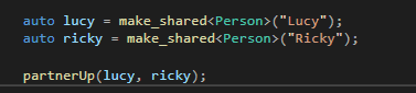 partnerUp 함수로 인하여 Person("Lucy") 객체의 shared_ptr 멤버 m_partner 은 Person("Ricky")객체를 참조하게 되었습니다. 그리고 동시에 Person("Ricky")객체의 shared_ptr 멤버 m_partner 은 Person("Lucy") 객체를 참조하게 되었습니다. A객체에 속한 shared_ptr이 B객체를 가리키게 되었고, B 객체에 속한 shared_ptr이 A 객체를 가리키게 된 것입니다. 이게 바로 순환 참조입니다.