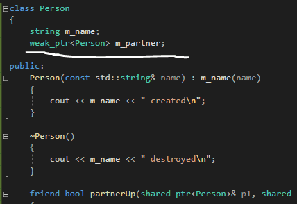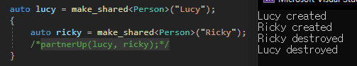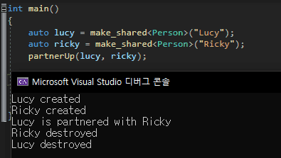 이렇게 될 수 있는 이유는 weak_ptr 참조는 객체 해제에 판단 기준이 되는 _Uses 카운팅에 포함이 되지 않기 때문입니다. 즉 Person("Lucy") 객체의 weak_ptr 멤버인 m_partner가 Person("Ricky")객체를 참조하는 것은 카운팅에 고려하지 않는다는 것이에요. 사실 순환 참조이긴 하지만 이 덕분에 순환 참조가 아니라고 판단되어 소멸 될 수 있는 것이에요.
