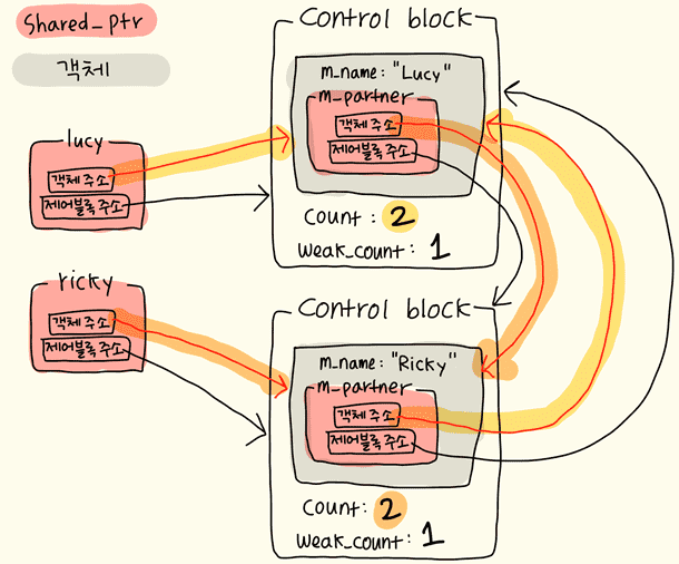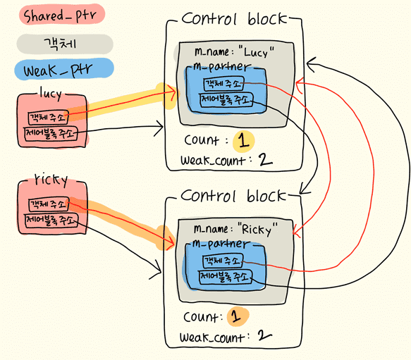 Person("Lucy") 객체를 가리키는 shared포인터 : 1. lucy (p1) 2. ricky(p2)가 가리키는 Person("Ricky") 객체의 m_partner
