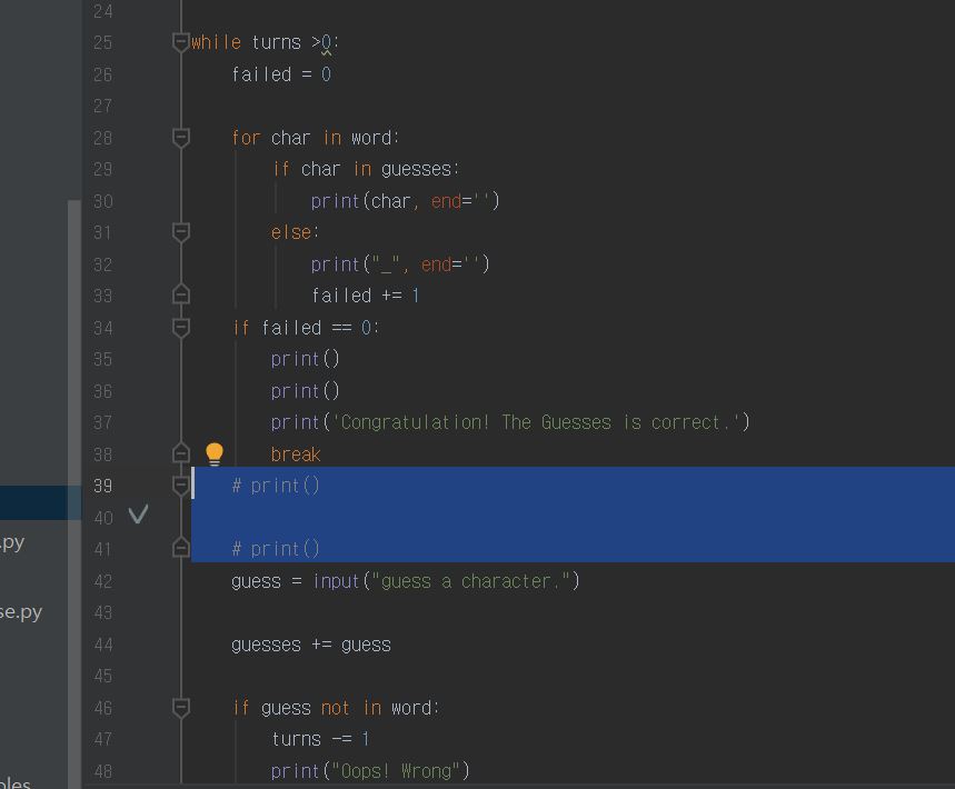 위의 사진에서 파란 줄 부분에 해당하는 print() 구문을 두 번 쓰면 _ _ _ _ _ _ 줄과 guess a character. 라는 줄 사이에 공백이 두 줄 생길 거라고 생각했습니다.