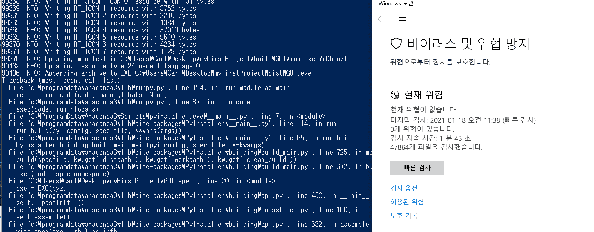 마지막으로 pyinstaller -onefile GUI.py 를 타이핑하였는데,