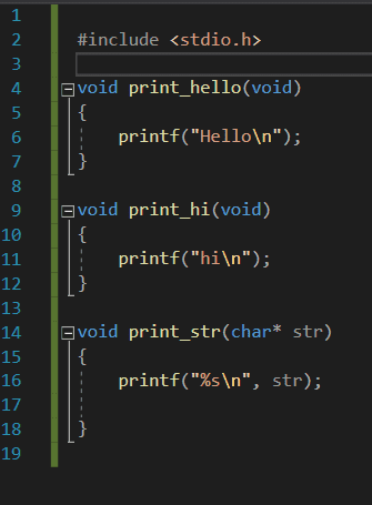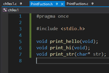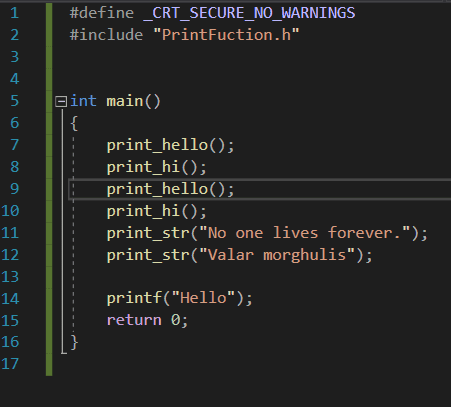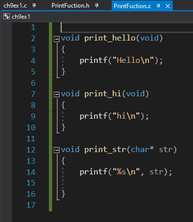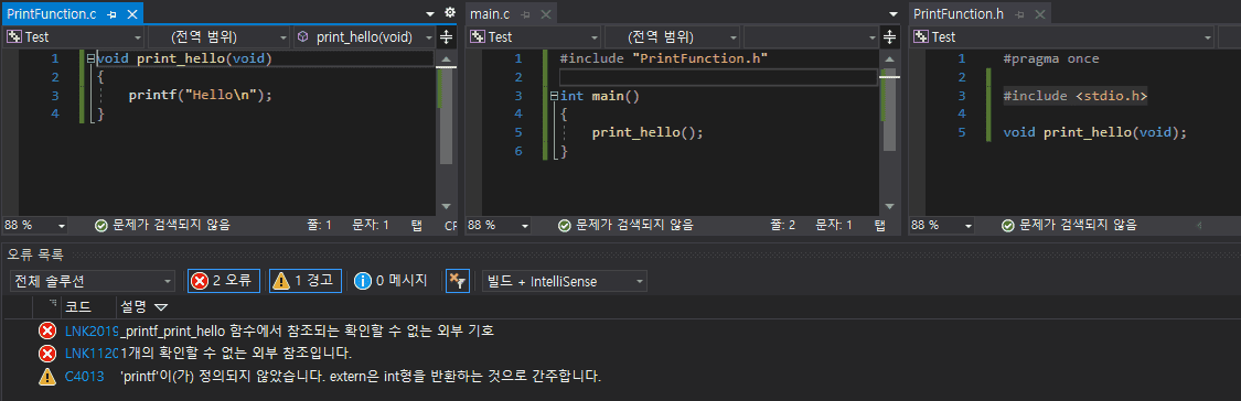 저도 VS 최신 버전을 쓰고 있는데 제 환경에선 함수의 바디가 있는 파일인 PrintFunction.c 에서 PrintFunction.h 헤더를 인클루딩 하지 않으면 실행시 바로 링크 에러가 발생했습니다. PrintFunction.c 에서 인클루딩을 해주지 않으면 이 친구 입장에선 printf가 뭔지 알 수가 없습니다. 질문자님께서는 문제가 없으셨다니까 의아하고.. 그 이유에 대해선 잘 모르겠네요 ㅠㅠ