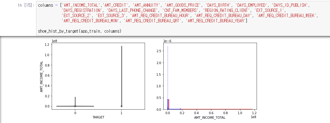 X축은 AMT_CREDIT 값일텐데 y축은 어떻게 해석해야 하는지 궁금합니다. AMT_CREDIT을 예로 들면 단위가 1e-6 라서 단순히 비중(x축의 bin이 전체의 몇%를 차지하는지)은 아닌 것 같고, density 인가 추측해봅니다.