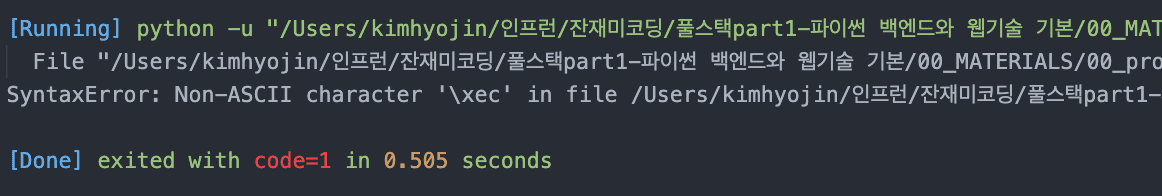 제 생각에, 우선 보통 한글 폴더, 특히 띄어쓰기까지 들어가있는 폴더명이 인코딩이 잘못 인식되서, 에러가 생긴 것이 아닌가 생각이 들어요. 모든 폴더명은 funcoding/fullstackpart1 과 같이 영어소문자로만 해보시면 우선 인코딩 문제는 해결될 것 같습니다.