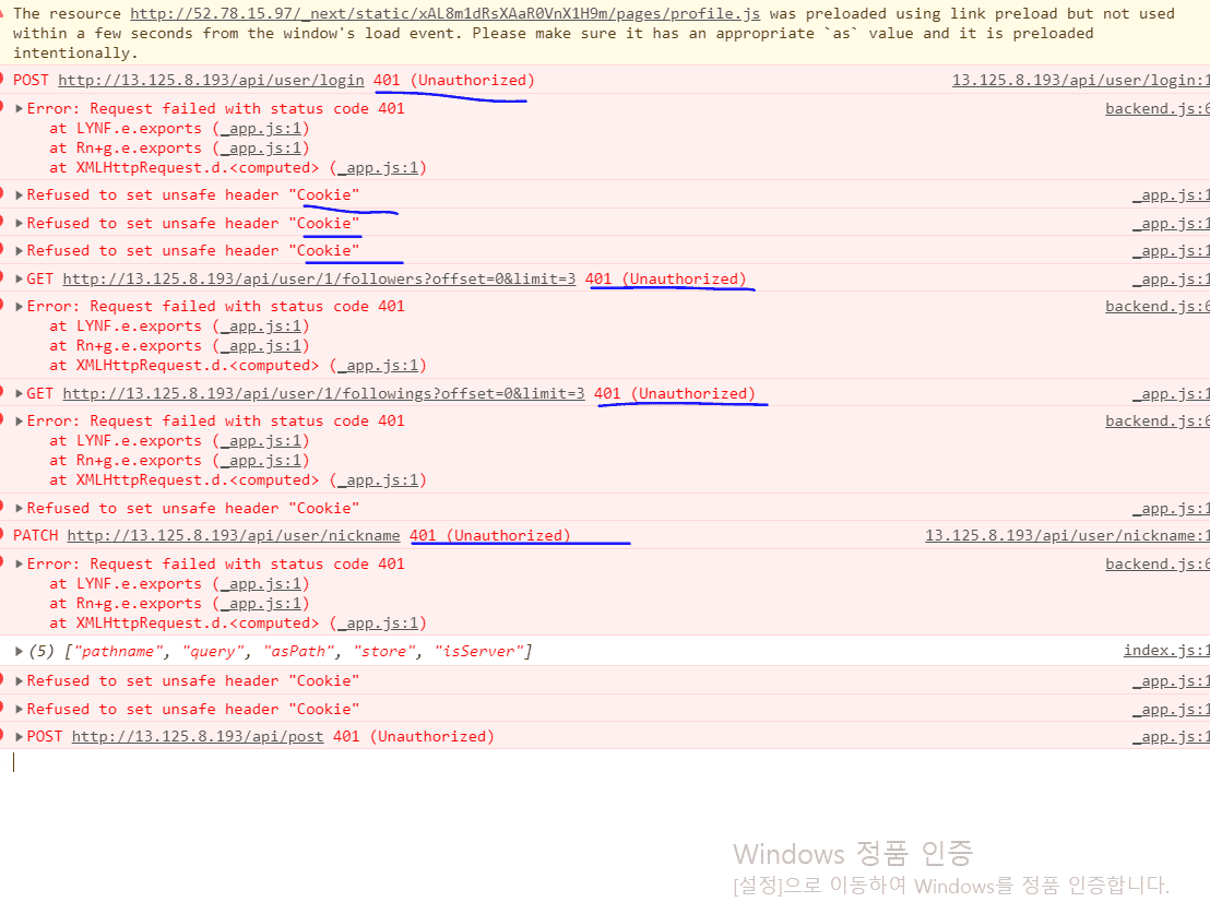 로그인 까지는 성공하였지만 Cookie 관련 이슈와 로그인 후 게시물 작성or 내정보에서 닉네임 수정등의 행동시 401에러가 발생합니다. 또한, 새로고침시 로그인이 풀려버리는 이슈가 발생합니다.